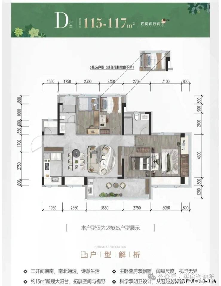而且此户型5开间朝南,餐厅处南北飘窗对流,主卧L型大飘窗,两个卫生间也带飘窗,采光超绝,令人身心舒畅。