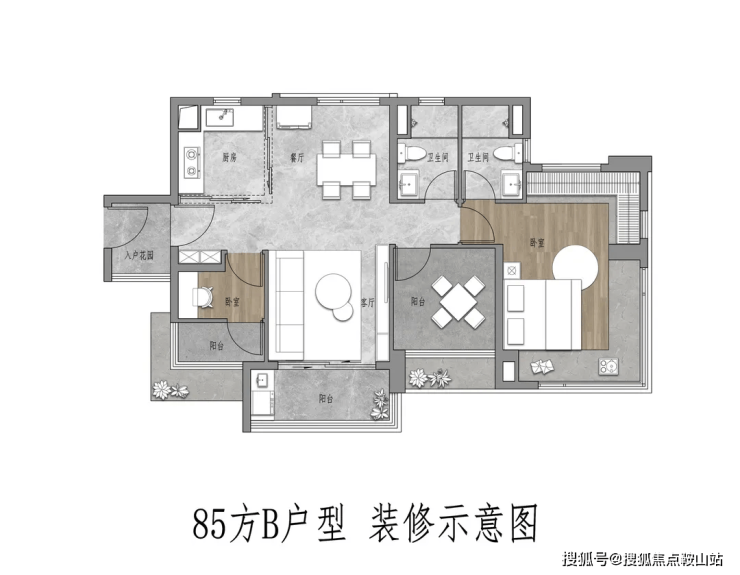 85㎡的 A、B 户型均为阳台、卧室全南向设计,采光优越。约 3.8 米开间的客餐厅空间开阔,适合家庭聚会。约 3.7 米开间的主套卧同样配备 270° 巨幕飘窗,提升居住品质。