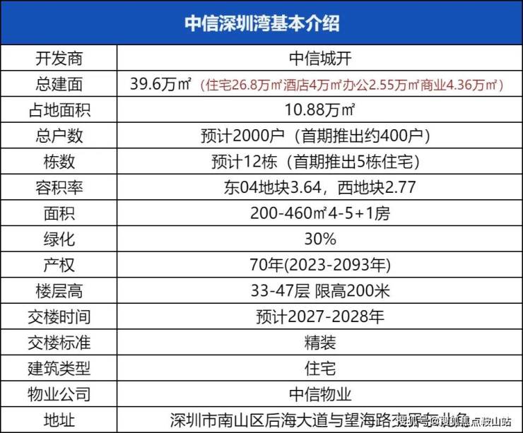 【中信信悦湾】共5栋超高层住宅,提供约400-450套住宅,为纯大户型社区!项目品质高端,三面环海,拥有永久性且近乎无遮挡的海景视野,并临近地标深圳歌剧院。项目规划推出最新面积段,不受7090政策限制