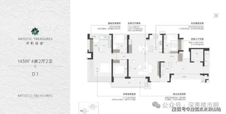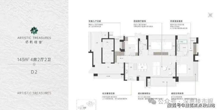 143㎡的4房2厅2卫,D2户型(05),设计的是横厅南北通透格局,独立专梯入户,送约12㎡的私用公区,客餐厅7.65米开间,LDKB一体化,四开间朝南,主卧270°无柱转角飘窗,4个卧室分别做到了主卧27.8㎡/次卧11.4㎡/次卧11.2㎡次卧11㎡(包含墙体飘窗),客厅出5.8米长的瞰海大阳台,L型岛台式厨房,烟道外置,公卫三段式分离,得房率约77.7%(包含赠送),西南朝向看海景。套内面积111.43㎡+赠送30.47㎡=实用面积141.9㎡,加上得房率约98.93%(不含公区)。