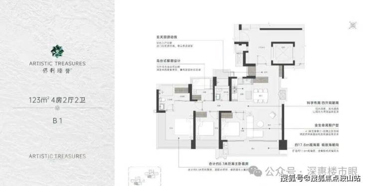 123㎡的4房2厅2卫,设计的是竖厅格局,独立专梯入户,送约6㎡的私用公区,客厅4.2米开间,LDKB一体化,S墙设计预留冰箱卡槽位,动静分区,四开间朝南,主卧270°无柱转角飘窗,4个卧室分别做到了主卧23.1㎡/次卧11.2㎡/次卧8.64㎡/次卧6.25㎡(包含墙体飘窗),客厅连接次卧出6.9米长的瞰海大阳台,L型岛台式厨房,烟道外置,卫生间干湿分离,得房率约77.7%(包含赠送),西南朝向看海景。套内面积96.06㎡+赠送18.12㎡=实用面积114.18㎡,加上得房率约92.34%(不含公区)。