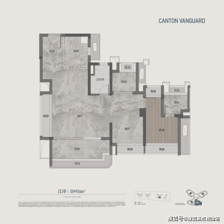 建面95㎡的4空间2厅2卫,四开间朝南,双面宽大阳台,约5.6m灵动宽厅和270°全景视野。