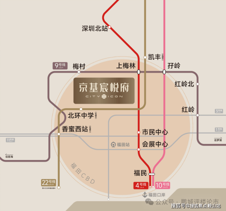 →三轨交汇:地铁9号/4号/22号线(在建中)三轨交汇,直距约300米上梅林站;22号线开通后,直抵香蜜湖