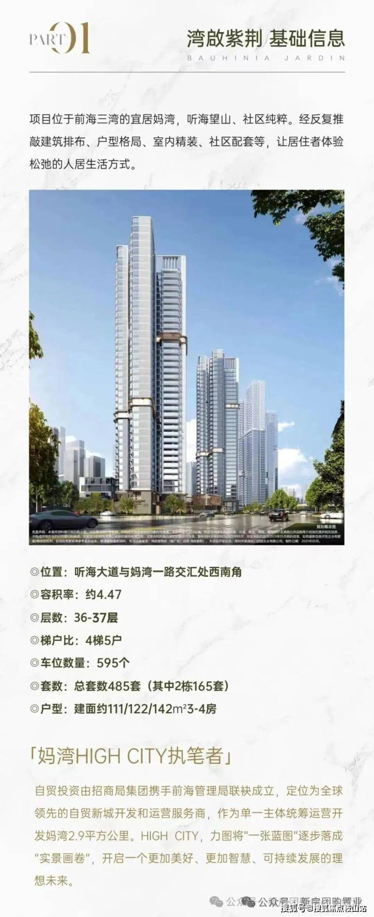 湾啟紫荆位于前海妈湾听海大道,占地约1.5万㎡,住宅建面约6.6万㎡,容积率5.14,共有三栋住宅组成,层高36-37F,共485户,车位595个,车位比1.1.2,4梯5户,主推约96㎡稀缺三房、111㎡3+1房、122㎡四房、142㎡四房。户型设计了大客厅、宽景阳台、阔景飘窗等,拥有山海河多重景观资源,计划品质精装交付。户型采用建筑新规设计,户户大阳台,4梯5户,分布式电梯设计,独立电梯厅。