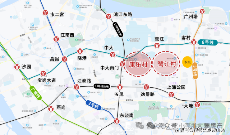周边有3/8/10/11号线,4条地铁交汇,这四条地铁线两两垂直交叉,把小区围在一个长方形内,可接驳 3 号线与 8 号线交汇客村站、8 号线鹭江站及在建的广州环线 11 号线逸景路站,可实现 1站广州塔2 站珠江新城琶洲西区,3 站体育西,4 站昌岗商圈