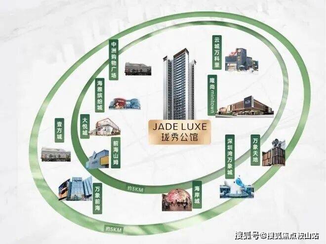 约3-5KM范围内:聚集南山前海山姆、云城万科里、万象前海、万象天地、海岸城、深圳湾万象城等高端及旗舰商业;以及宝中海雅缤纷城、大悦城、中洲购物广场等潮流商业MALL;