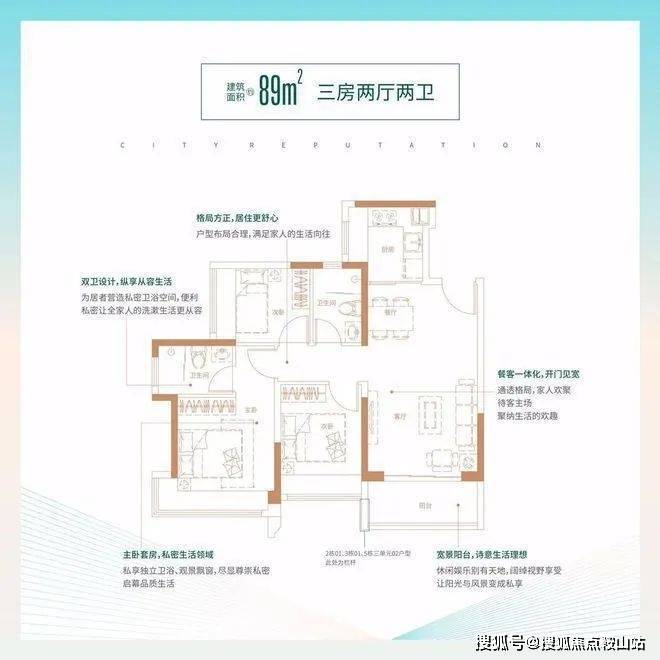 89㎡的3房2厅2卫,5栋01户型,设计的是竖厅南北通透格局,客厅3.6米开间,一体化双厅,三开间朝南,主卧270°转角飘窗,U型厨房,卫生间干湿分离,得房率:74.71%(不含赠送),阳台主朝西南向。
