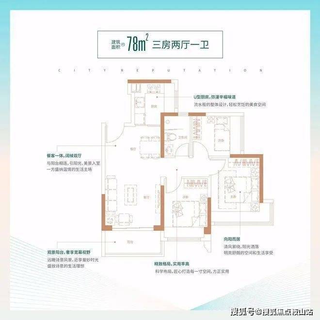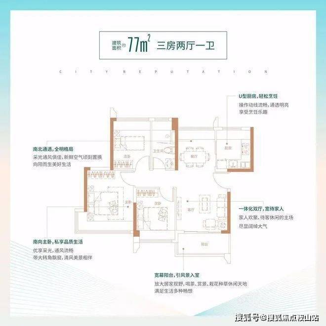 77㎡的3房2厅1卫,1/2栋04户型,设计的是竖厅南北通透格局,客厅3.4米开间,一体化双厅,三开间朝南,主卧270°转角飘窗,U型厨房,卫生间干湿分离,得房率:78.43%(不含赠送),阳台主朝南向。