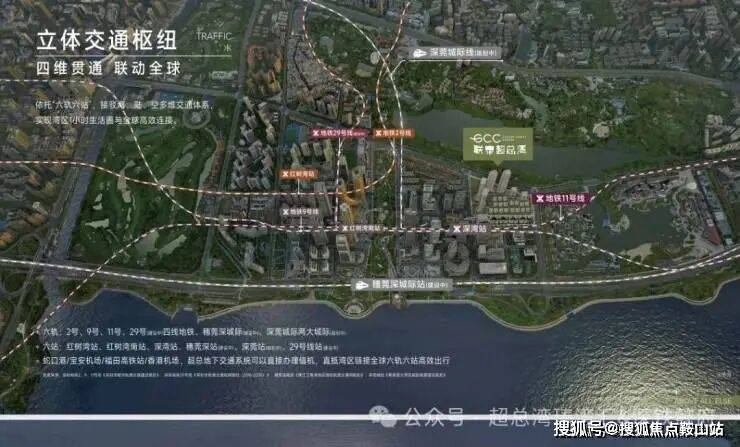 深超总规划"六轨六站"立体交通网络,包括地铁2、9、11号线,规划中的29号线以及穗莞深、深莞城际轨道。TOD模式实现站城一体化,无缝接轨三地铁换乘,引入城市航站楼值机服务,实现10分钟直达深圳湾口岸、20分钟通达前海的城市高效连接。滨海大道综合改造工程打造地下四层立体交通,汇聚城市道路、公交系统和城际铁路,成为大湾区交通核心节点。