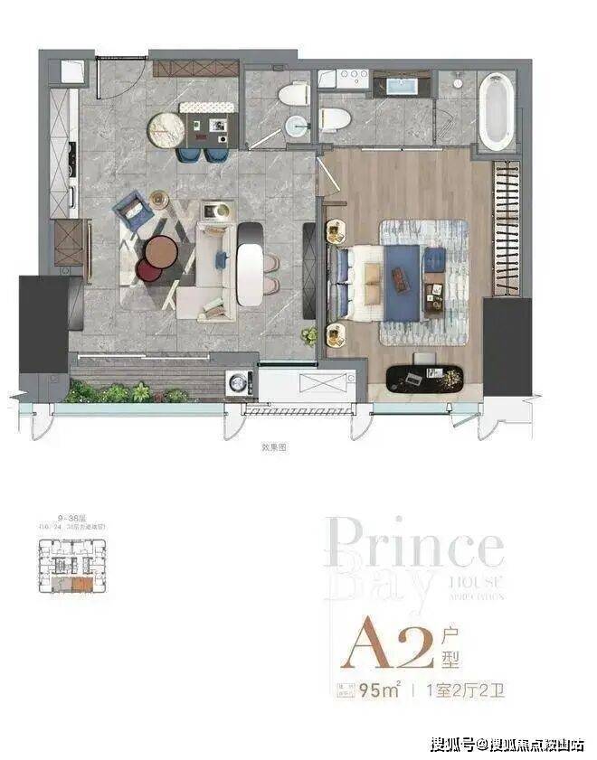 南向(9-38层) A2户型,95㎡ 1室2厅2卫,虽然卧室的衣柜空间少了,但是却却多了一个卫生间,还带浴缸!