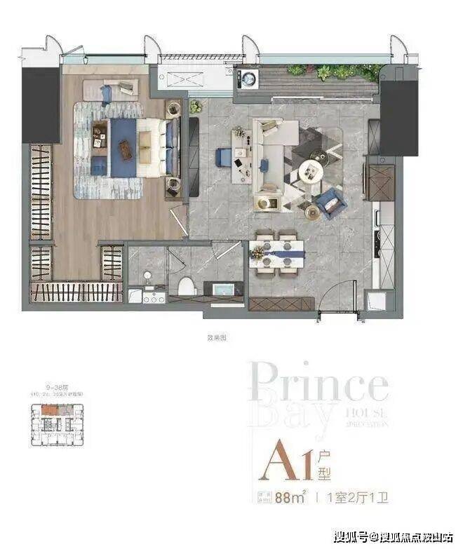 北向(9-48层) A1户型,88㎡ 1室2厅1卫,特点是卧室有很大衣柜空间