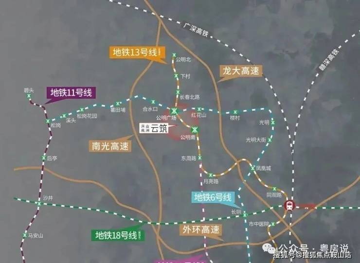 深业云筑,位于深圳市光明区公明街道马田街道石家社区,地处光明科学城大科学装置区,是粤港澳大湾区核心区域及广深科技创新走廊重要节点,承接南山区科技外溢,毗邻东莞松山湖,区位优势显著。项目紧邻地铁6号线公明广场站(1.1公里)及在建13号线公明南站(约700米),未来可直达南山科技园、后海总部基地;周边龙大、南光高速无缝衔接福田、南山,交通便捷