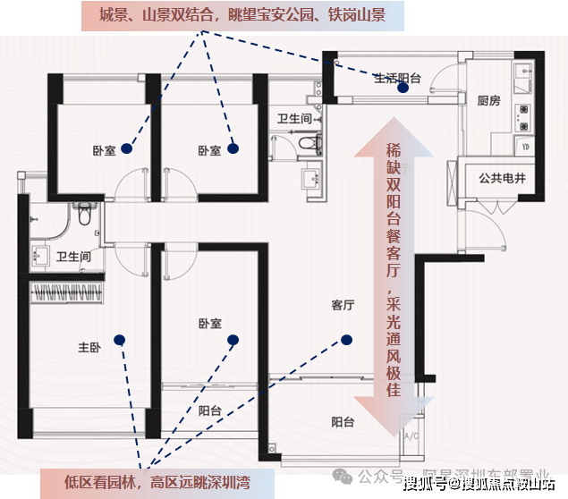 三阳台:前海黄金圈内,唯一在售89㎡三房两卫三阳台,客厅阳台进深2米,堪比140㎡大户型阳台