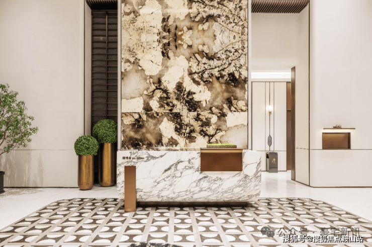 尊崇高定大堂,精研艺术与生活交融之美,雕琢金属与石材材质的自然奢华,营造艺术感的归家体验,遇鉴居者精奢高雅的审美。