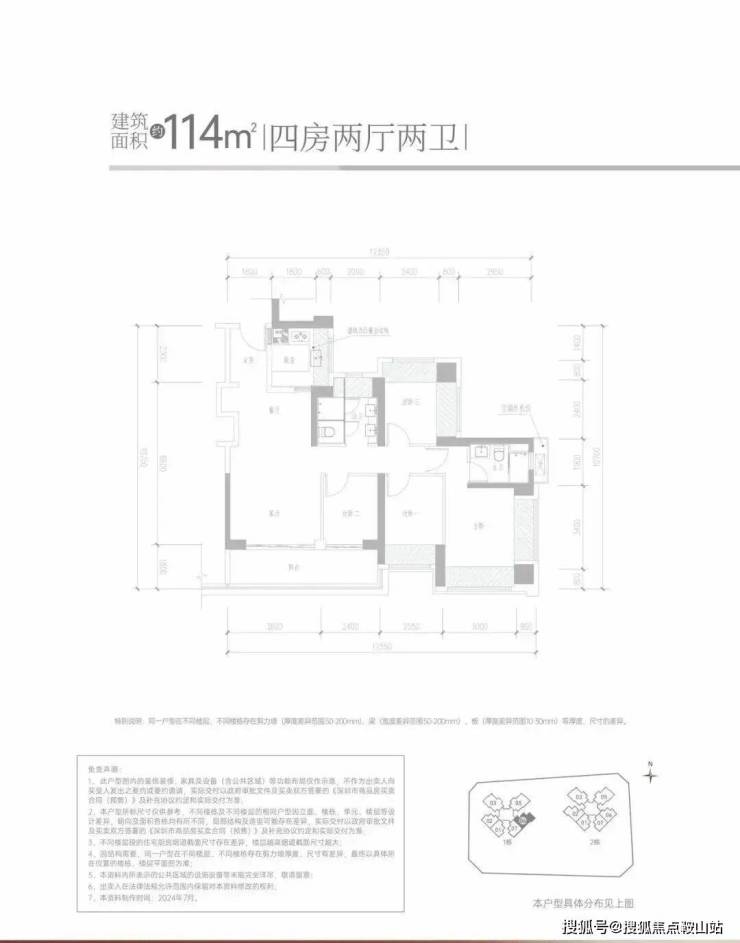 114㎡的4房2厅2卫,设计的是经典竖厅格局,客厅3.8米开间,进门独立玄关,LDKB一体化设计,S墙设计预留冰箱卡槽位,4个卧室分别做到了3.8米/3.2米/2.55米/2.44米的宽度,U型厨房,公卫三段式分离设计,得房率约:95%(包含赠送),客厅连接次卧出6.2米的大阳台,朝东南向。