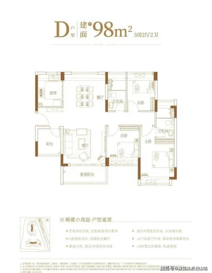 98㎡三房:南向竖厅设计,约 6 米宽景阳台,主卧带 270° 无柱飘窗,空间开阔无遮挡。