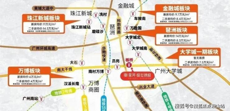 交通地铁:星河盛世锦城位于万博 CBD 北侧,直线距离 7 号线板桥站约 700 米(三期组团稍远),实测步行 10 分钟内可达。地铁 2 站到万博、5 站到琶洲,换乘 18 号线可快速通达珠江新城,适合在天河、海珠上班的通勤族。自驾方面,出门即上南大干线,无缝连接广州南站、金融城等核心区,实测 30 分钟可到珠江新城,交通便利性是最大卖点之一。