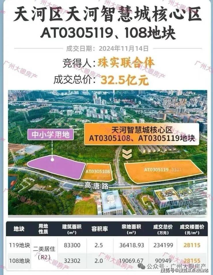 2024年11月14日,珠实联合体底价拿下天河智慧城地块,成交总价32.5亿元。