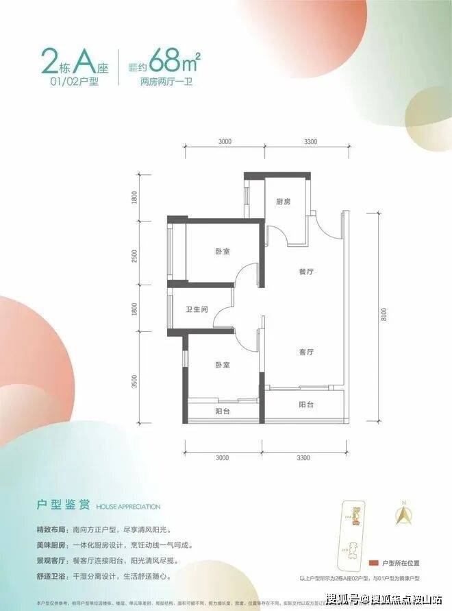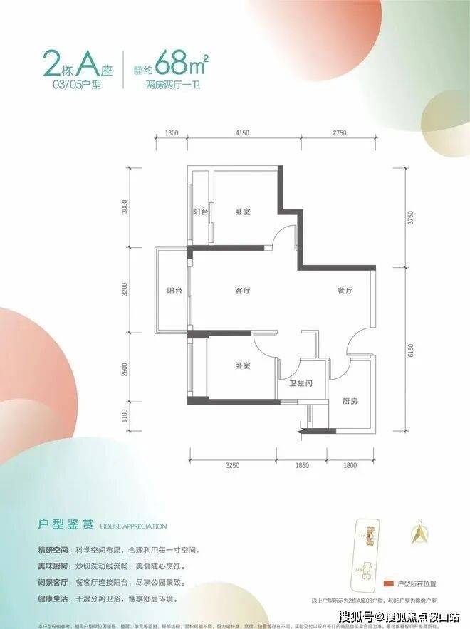 68㎡的2房2厅1卫,2栋A座03.05户型,设计的是竖厅类双龙抱珠格局,客厅3.2米开间,2个卧室分别做到了主卧10.05㎡/次卧8.58㎡(包含墙体飘窗),得房率约74.05%(不含赠送),朝正西向。