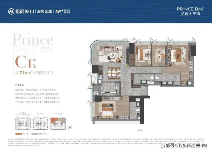 4居室(216-415㎡):高端户型,216㎡户型厨房为封闭式设计,配备两个主卧套房;415㎡户型分布在8-31层,拥有东南、西南看海,东北看大小南山+部分海景的多重景观。