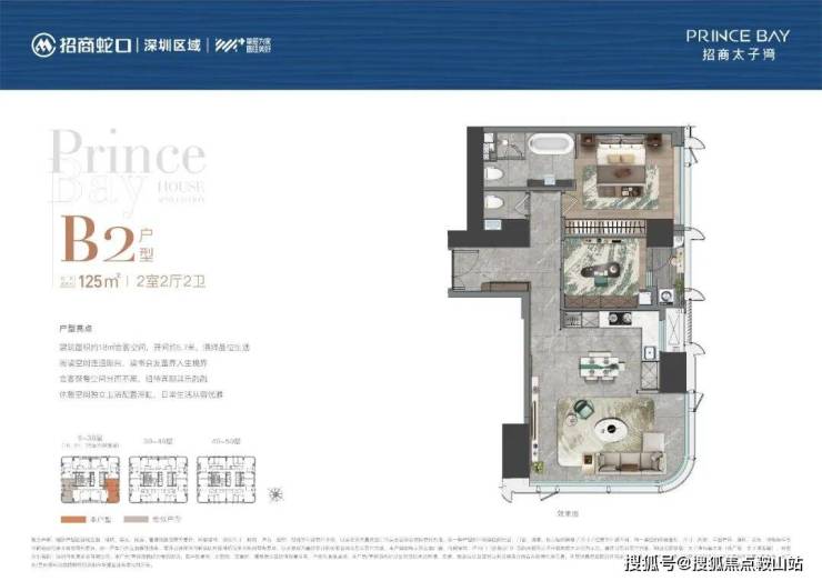 项目建筑总层数50层,公寓位于9-50层(1-8层为商业),建筑高度194米。项目采用国际知名设计单位10Design、ACLA负责建筑与景观设计,以水中动态的倒影为创作灵感,打造优雅而具有辨识度的外立面。太子湾片区规划总建筑面积约170万㎡,总占地约69万㎡,汇集办公、居住、商业、艺术中心、酒店等多元业态。