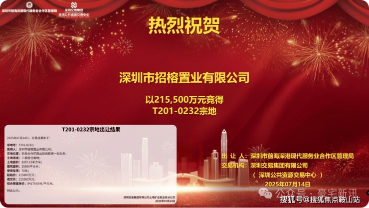 2025年7月14号招商经过158轮竞价,在深圳公共资源交易中心以21.55亿,斩获了前海核心区 北部一块mini的小三角新宅地-T201-0232宗地,溢价率86.1%,楼面价约8.4万,刷新了深圳涉宅土拍楼面价地王,记录至今未被打破。