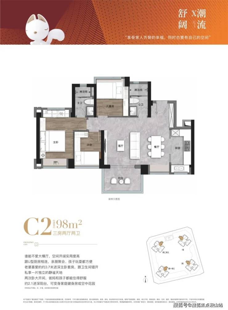 建面约98㎡3房2卫,优质改善户型