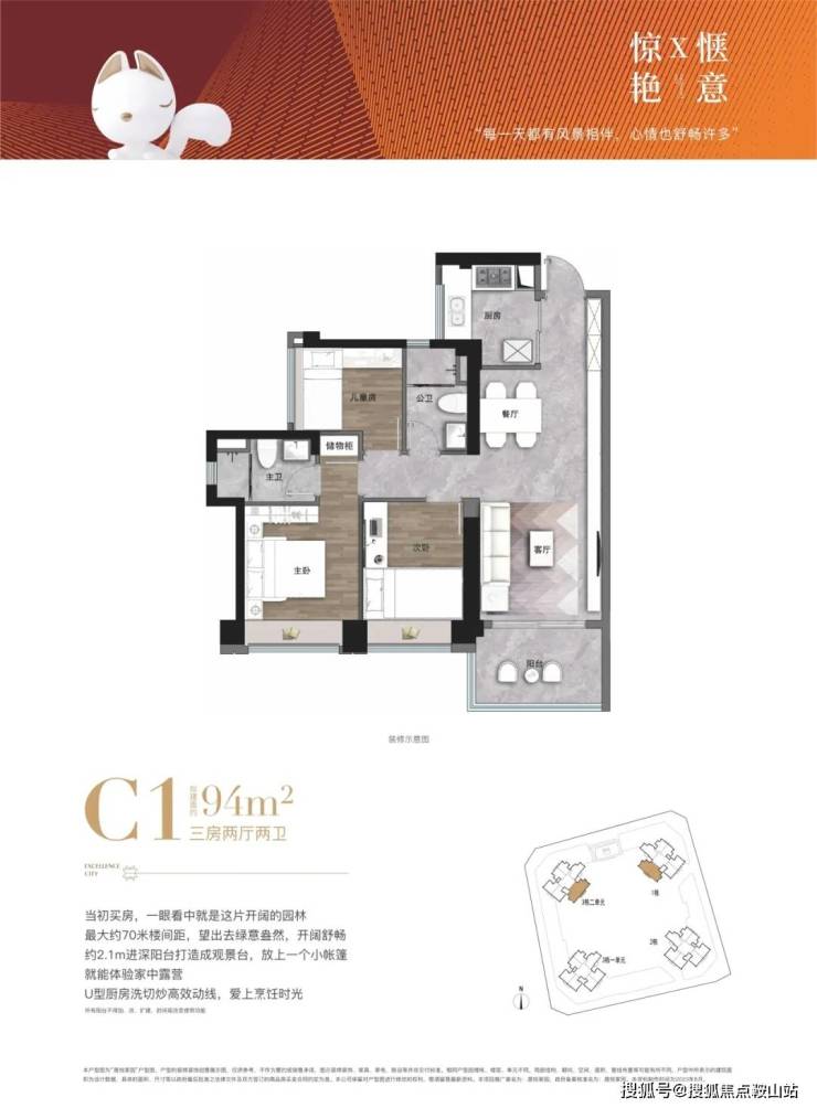 建面约94㎡3房2卫,景观视野极佳