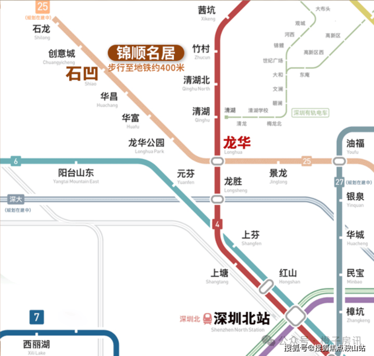 项目旁边约400米地铁25号线石凹站(在建中,预计2028年运营通车),4站龙华中心/5站深大城际龙胜站/7站红山/8站深圳北站。