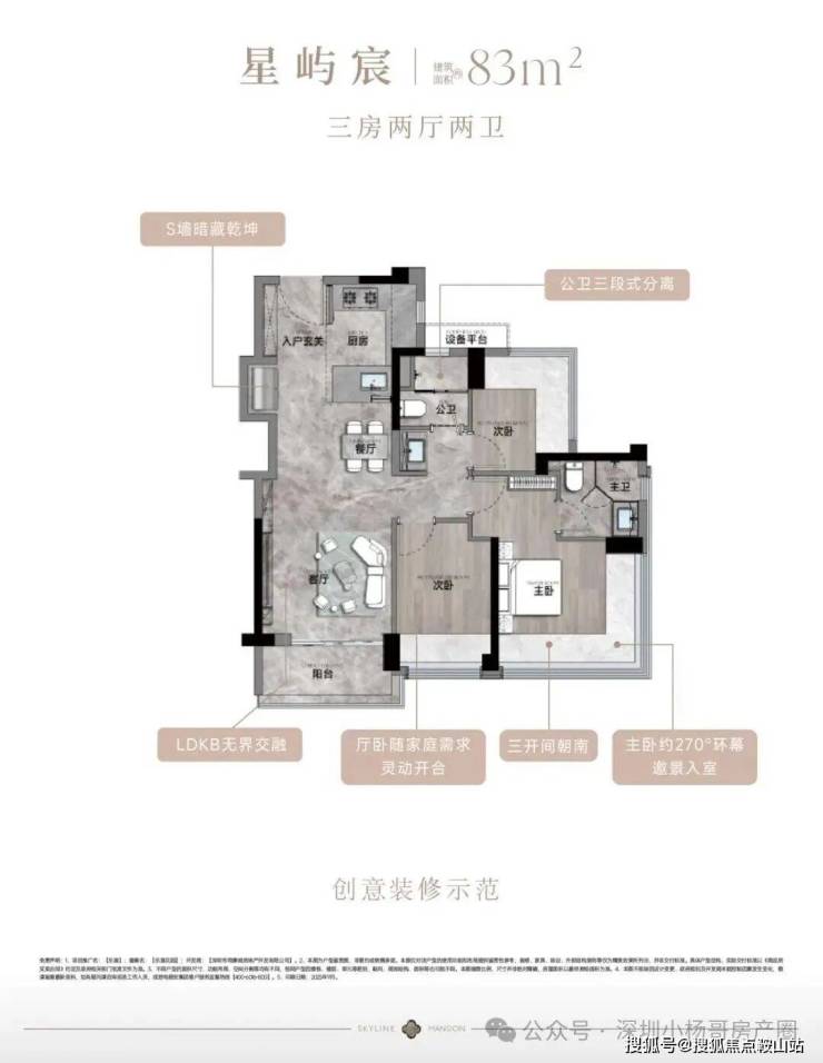 83㎡的3房2厅2卫,设计的是经典竖厅格局,客厅3.35米开间,LDKB一体化,S墙设计预留双开门冰箱卡槽位,三开间朝南,动静分区,分别做到了主卧16.02㎡/次卧9.08㎡/次卧7.01㎡(包含墙体飘窗),U型厨房,公卫三段式干湿分离,赠送1.98平设备平台,得房率约77.15%(不含赠送),阳台5.02m²西南或东南朝向。亮点:83平做到了3房2卫,主卧270°无柱转角飘窗,厨房烟道外置+额外赠送设备平台,并且是纯南向格局。(83平没有做实体样板间)