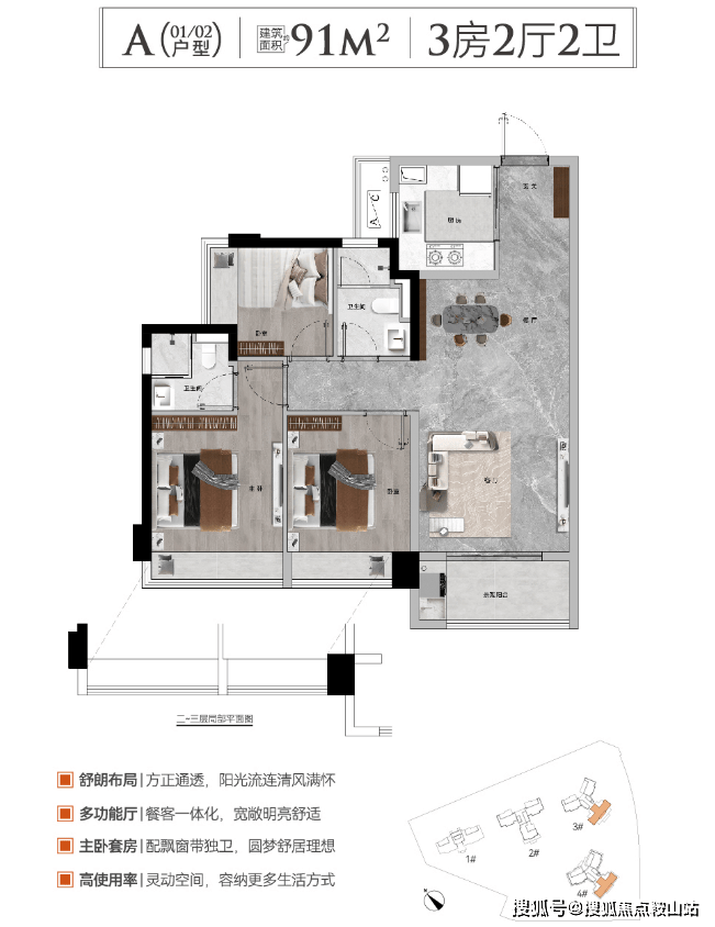 约91㎡,3房2厅2卫,高实用率,餐客一体化,宽敞明亮舒适
