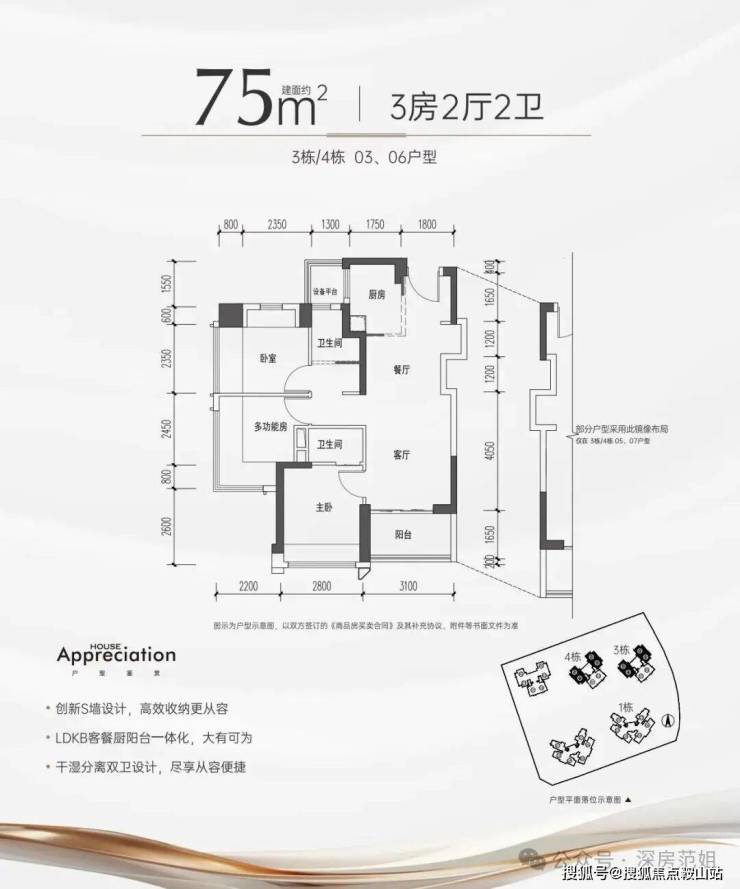 该地块有5栋住宅,全部为新规户型,得房率达到了100%-106%,属于该区域唯一新规产品。本次计划首推1栋总45层/3栋/4栋总43层,共3座楼栋,约780套住宅产品,面积有建面约75㎡3房2卫、80㎡3房2卫、83㎡3房2卫、85㎡3房2卫,3房产品共4款不同户型,另有94㎡4房2卫、105㎡4房2卫,层高43层左右,3梯6户设计。