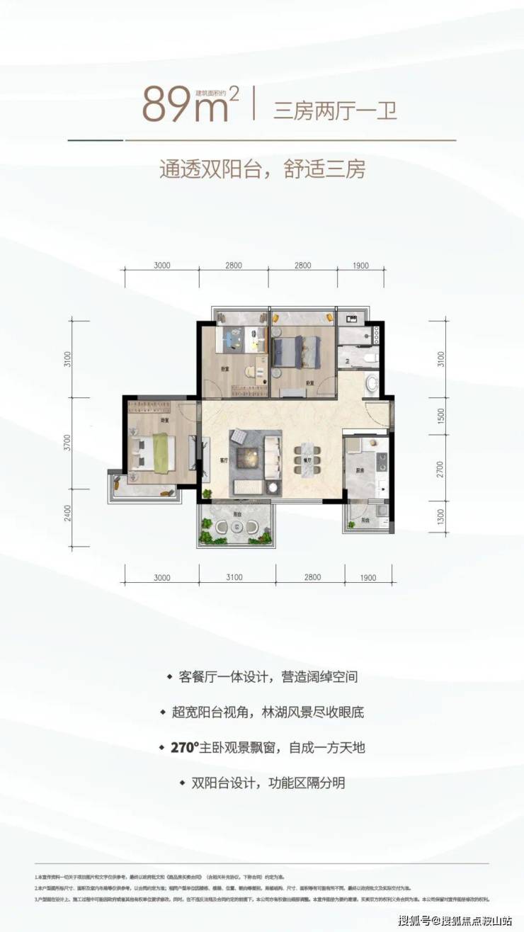 约89㎡三房两厅一卫:通透双阳台,三口之家的舒适三房