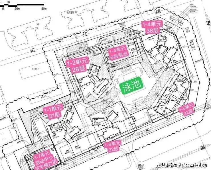 总占地面积约2.19万㎡,总建面约12.42万㎡,容积率约3.65,绿化率25.01%,总规划504户全都为商品房,共5栋28-38层的住宅组成,2梯4户和3梯4户,1栋1单元31层,2单元38层,4单元38层,5/6单元32层,3单元为商业及社康中心,车位比约1:1.28,地下2层。