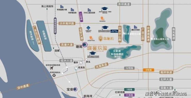**项目位置**:宝安沙井中轴,11号线**塘尾站**300米(步行5分钟),紧邻宝安大道、凤塘大道,**6站宝中、7站前海、11站车公庙**,半小时直达南山/福田核心区。