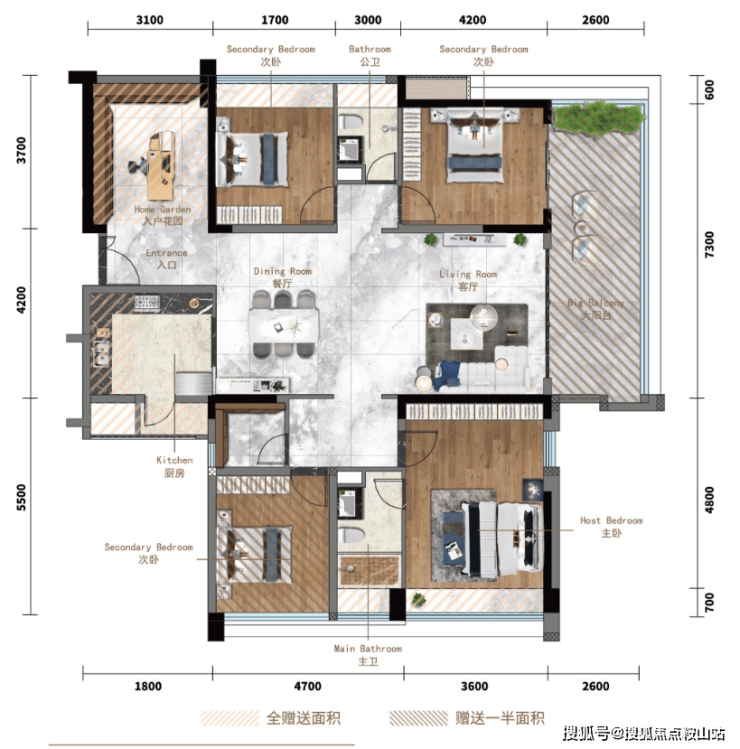 项目二期8栋02户型144㎡央景楼座户型,可瞰五桂山以及东区市区景观,还能看到星河CoCo City商超。在空间布局上,144㎡户型拥有专属入户花园,面积全赠送。