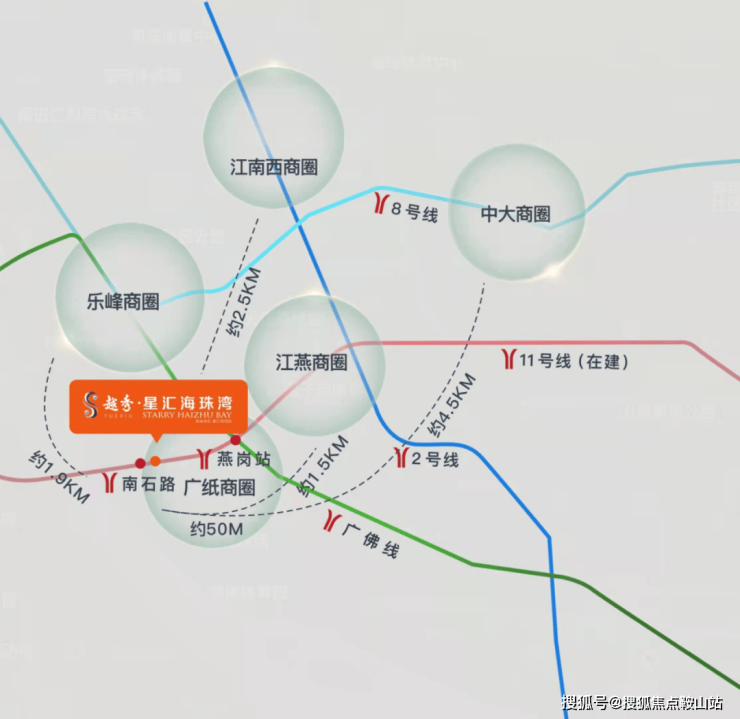 广州11号线(在建)贯穿项目,广州首条环城地铁,0换乘直达琵洲、广州火车站、广州东站;距广佛线燕岗站约450米,接入3号线,7站到达珠江新城;海珠环岛路(在建)工程进度不断刷新,价值即将兑现。