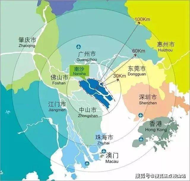 翻开粤港澳大湾区地图,我们发现以南沙为中心,100公里范围内汇集大湾区全部11个城市。