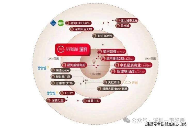 项目自身规划了约4.4万㎡的集中商业,预计2027年与项目同步开业,将满足业主的日常购物、餐饮、亲子等多元化需求。 同时,项目与周边在建的卓弘星辰(3.6万㎡)、名居山河里(3万㎡)、新世界188(9万㎡)等商业体共同构成超20万㎡的“家门口”商圈。 5公里范围内,星河COCO Park、龙岗山姆会员店等百万级商业综合体环伺,尽享都市繁华。