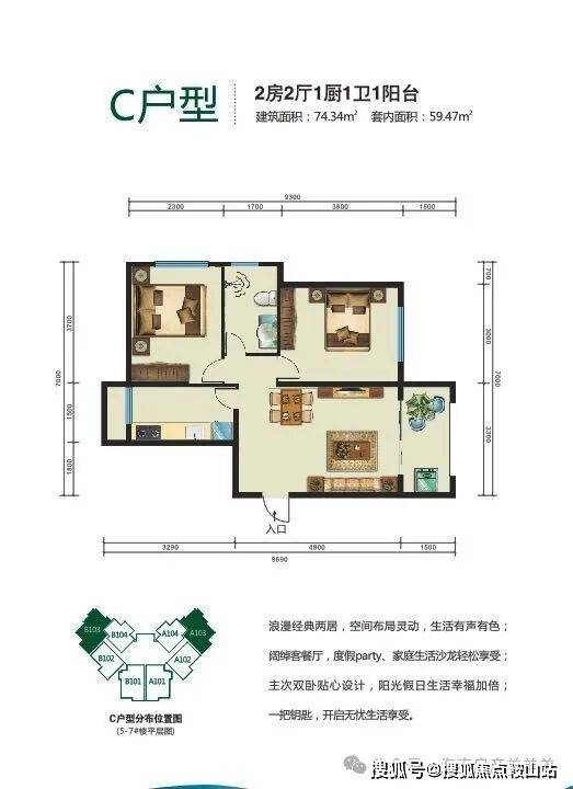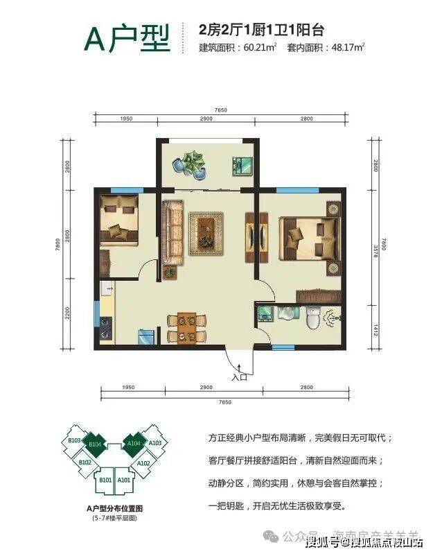 主力户型:53.47平一房一厅、60.22平二房二厅,73.06、77.98平二房二厅