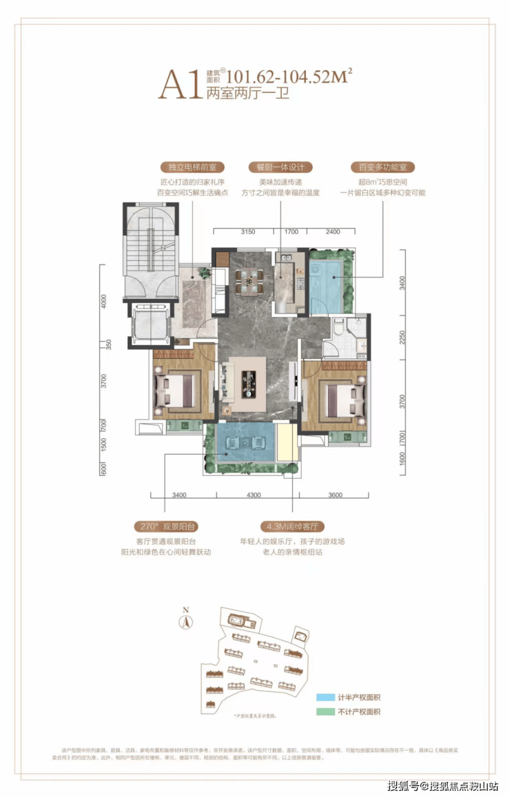 户型亮点:电梯入户送入户花园,得房率高达97%,客厅4.3米大开间,宽2.8米大阳台,阳台面积可达约14㎡,层高3.1米,南北通透通风好,次卧与主卧分隔开私密性好,明厨明卫