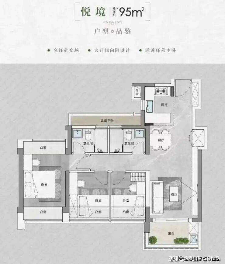 95㎡的3房2厅2卫,设计的是经典竖厅格局,进门入户玄关,LDKB一体化,S墙设计预留冰箱卡槽位,四开间朝南,U型厨房,卫生间干湿分离,还带1个超大设备平台,得房率约95.47%(包含赠送),东北朝向。