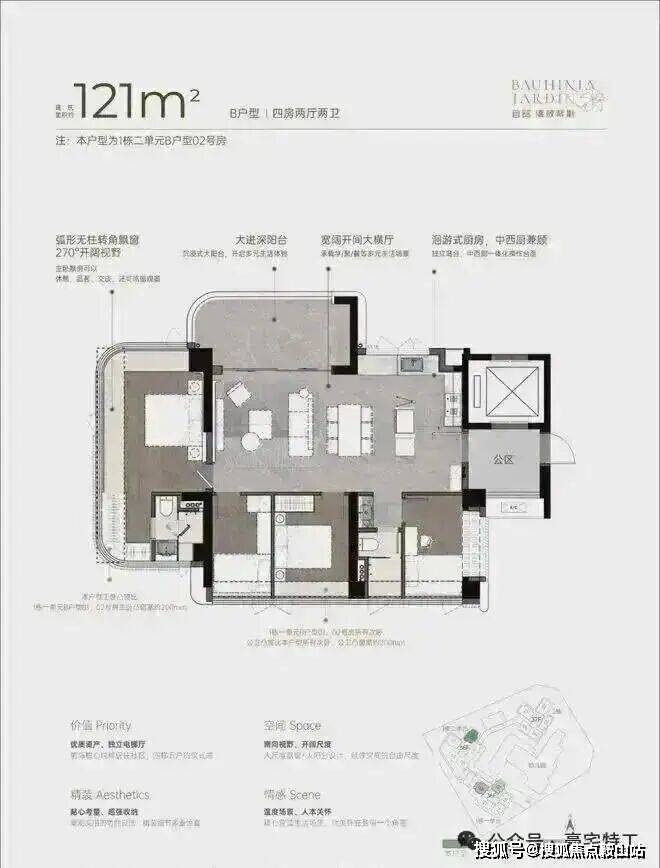 • 270°弧形无柱大尺度飘窗、大宽厅、大阳台,带来更多使用空间。