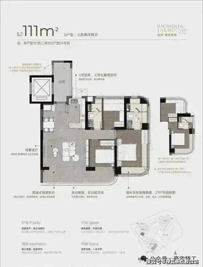 双龙抱珠户型,整个户型非常通透。书房分布于客厅另一侧,难得的双面采光+270°景观视野。主卧南北通透,景观面开阔。