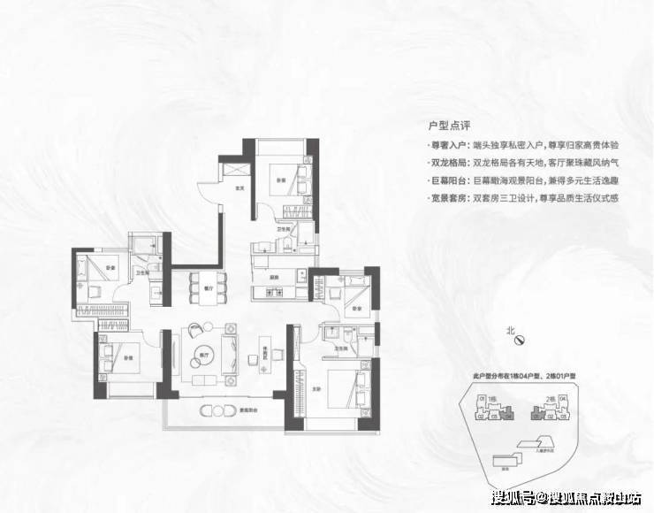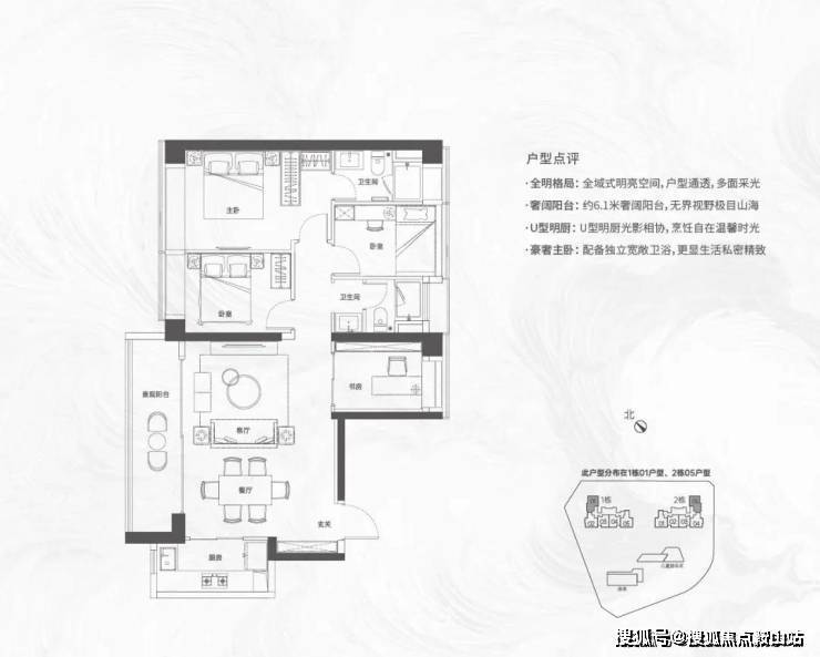 【124㎡的4房2厅2卫】1栋01/2栋05户型,电梯入户送独立公区,横厅南北通透格局,客餐厅6.1米开间,五开间朝南,主卧大套间设计,6.1米长观景大阳台,U型厨房,得房率:72.07%(不含赠送)西北或东南朝向;