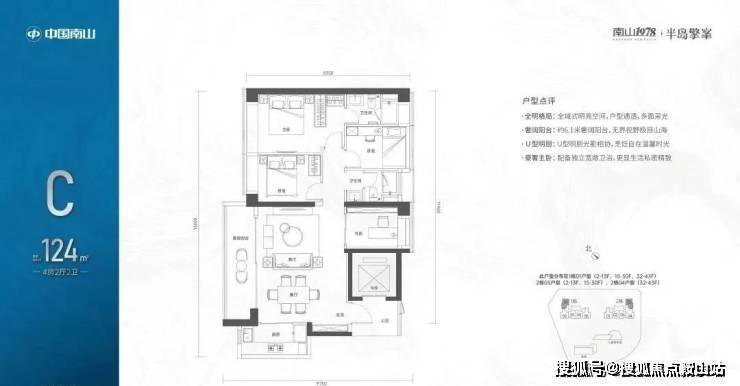 【124㎡的3+1房2厅2卫】1栋02/2栋04户型,电梯入户送独立公区,设计的是竖厅格局,动静分区,主卧套间设计,还有一个多功能间可以做书房,U型厨房,公卫三段式分离,得房率:72.07%(不含赠送)西南朝向;