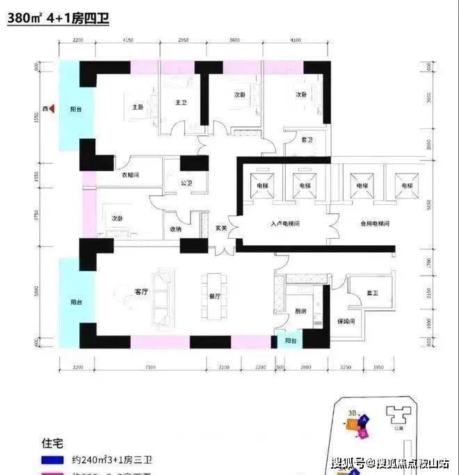 约280㎡4+1房4卫 B户型,西南朝向看城市景观,高层可看深圳湾海景;