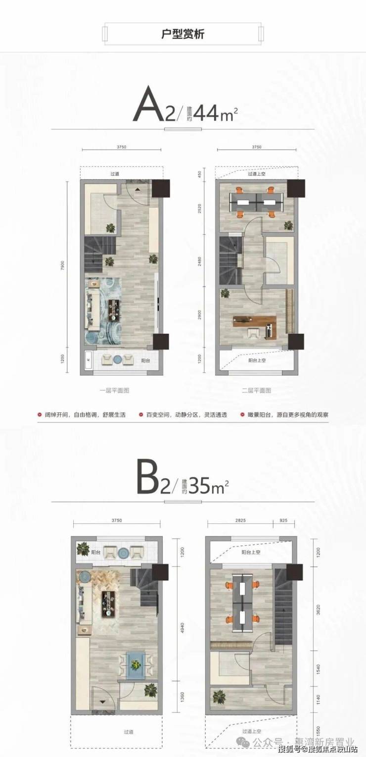 项目规划建筑面积约35-100㎡的轻奢资产,在售主力面积分别是35㎡的A户型和43㎡的B户型,均为两房两厅两卫户型;