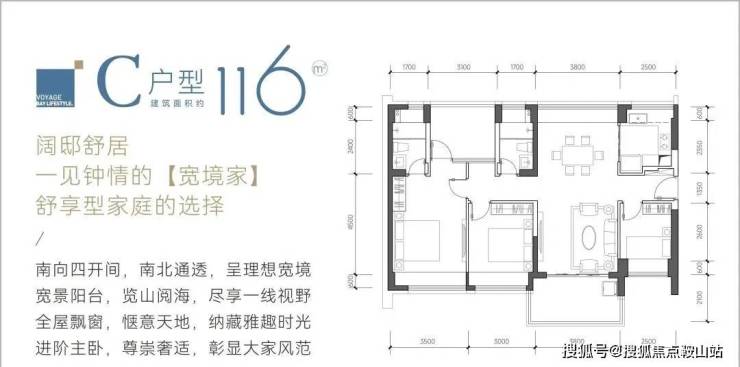 116㎡的4房2厅2卫,C户型,设计的是竖厅南北通透格局,餐客厅一体化设计,客厅3.8米开间,四开间朝南,4个卧室分别做到了主卧17.85㎡/次卧11.4㎡/次卧9.3㎡/次卧8㎡(包含墙体飘窗),都不用搭配飘窗做床,U型厨房,卫生间干湿分离,得房率约:93.13%(包含赠送),阳台主朝西南、东南或正南向。