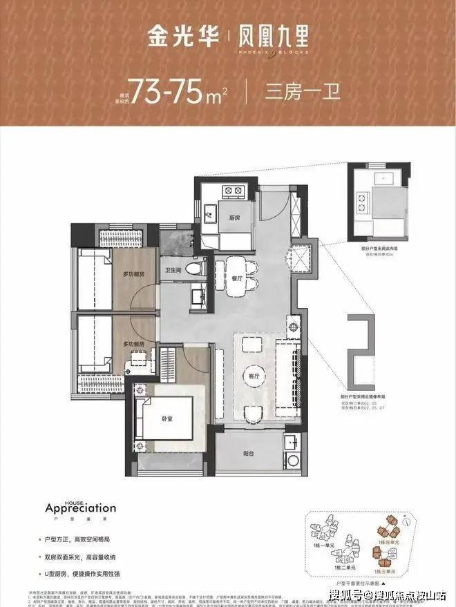 73㎡的3房2厅1卫,设计的是竖厅格局,S墙设计预留冰箱位,双次卧双面采光,U型厨房,卫生间三段式分离设计,有西南朝向及东南朝向。